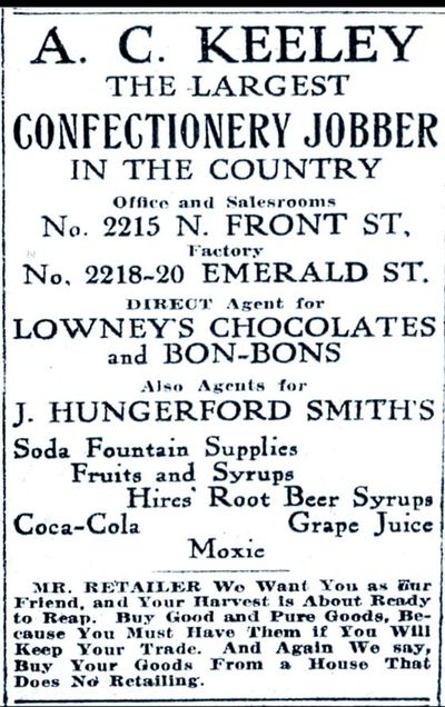 A.C. Keeley, until his untimely demise, held the distinction of being the largest candy wholesaler in Eastern Pennsylvania. Beyond his role in wholesaling confections for esteemed brands, he erected his own three-story candy factory at 2215 Front Street in Kensington, Philadelphia, producing premier lines of sweets.